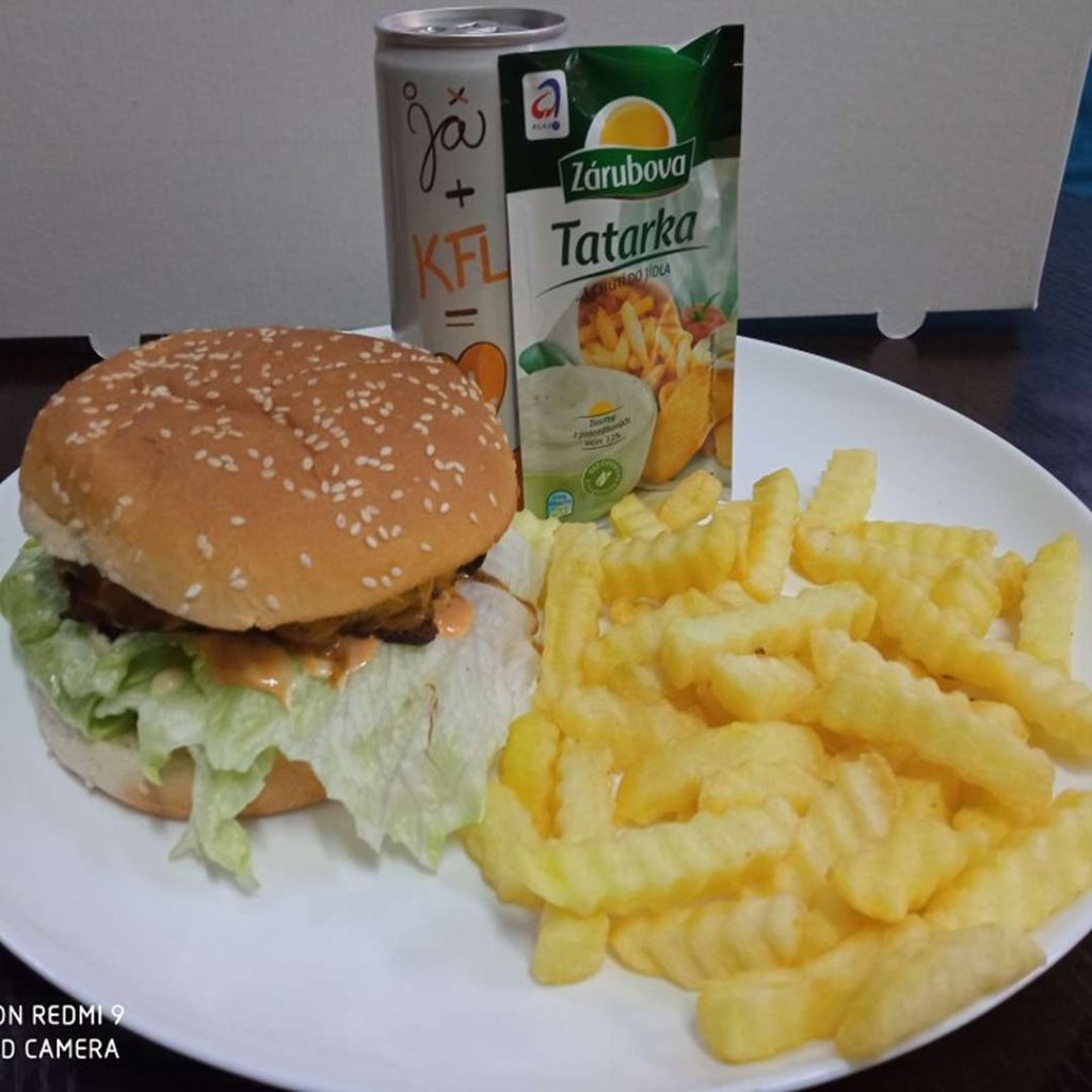 - 500. Cheese Burgr + hranolky + Kofola 0.33l + tatarka