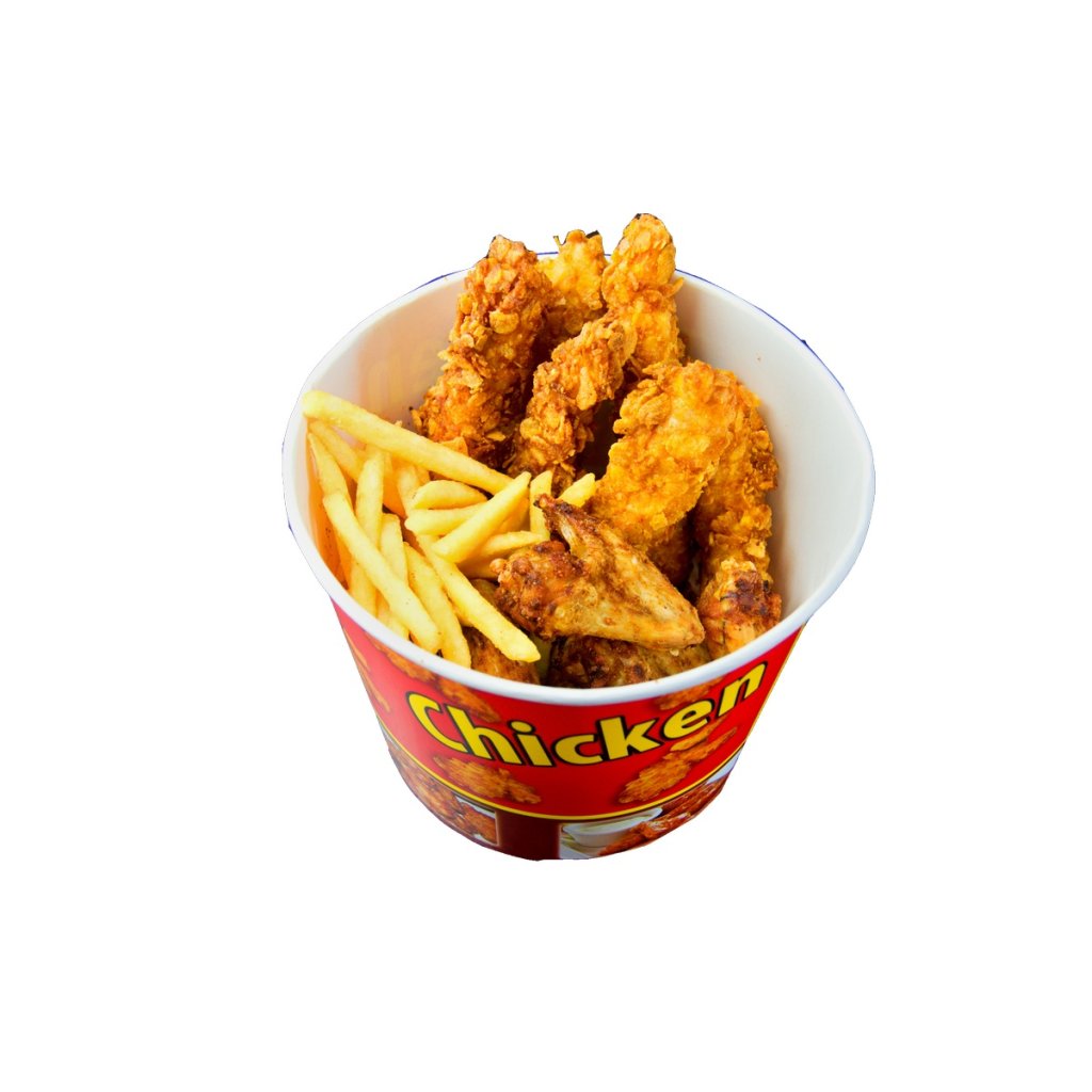 404. Kuřecí box stripsy, křídla, double hranolky, omáčka, cibulové kroužky